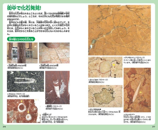 ▲身近なところにこんな化石が!? 街中の壁や床材に使用されている大理石の中の化石を紹介。
