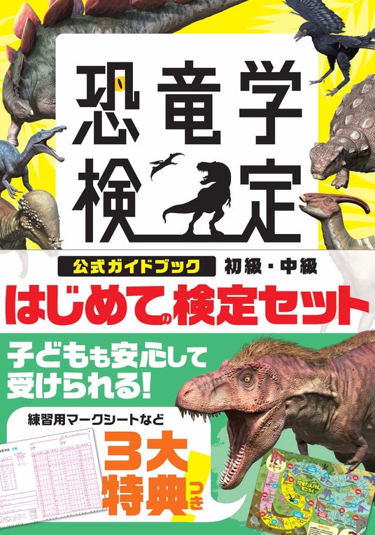 「恐竜は大好きだけど、検定を受けたことがないので受験を迷っている」というお子様と保護者の方に向けて、公式テキストのスペシャル版『恐竜学検定公式ガイドブック 初級・中級 はじめての検定セット』を2025年6月5日(木)に発売いたします。公式テキスト『恐竜学検定公式ガイドブック 初級・中級』に、本番と同じ仕様で解答できる「練習用マークシート」や、遊びながら学べる「すごろくポスター」、「合格お守り」の3大特典が付いています。全国書店やネット書店で予約を開始しています。また、公式テキストの通常版は発売中です。