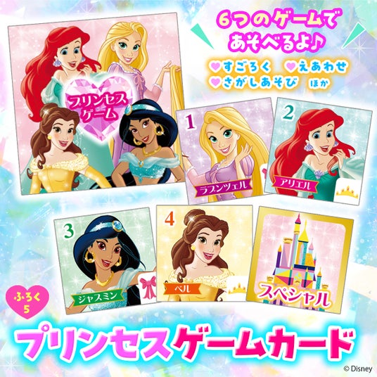 ラプンツェル、アリエル、ジャスミン、ベル、人気のディズニープリンセスの絵柄がすてきなゲームカード。このゲームカードを使って、すごろく、絵合わせ、プリンセスさがしほか、6つのゲームが楽しめます!! ひとりでも、家族やお友だちといっしょでも、楽しく遊んで盛り上がりましょう。