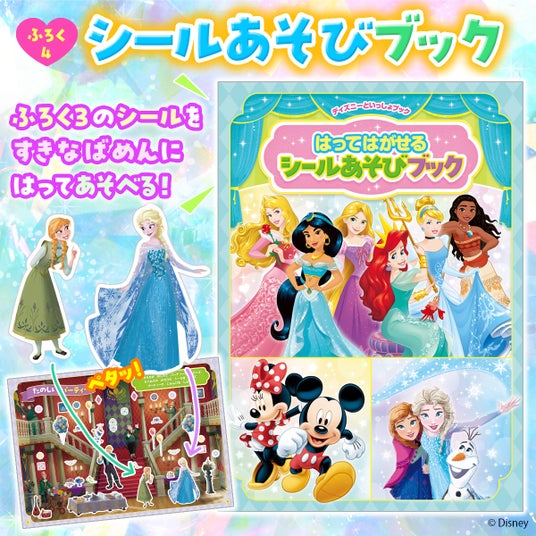 付録3の「はってはがせるキャラクターシール」を、好きな場面にはって遊べるブックです。『アナと雪の女王』のパーティー、ディズニープリンセスのきせかえ、ミッキー&フレンズのお庭、3つの場面にシールをはり放題♪