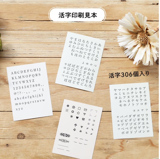 ひらがな・カタカナ・英字・数字・記号・飾り罫の活字が全部で306個入。インキや印刷用紙もついて、すぐに活版印刷が始められるキットです。