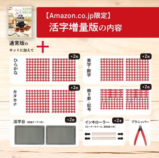 【Amazon.co.jp限定】版は、通常版の3倍の活字が入って、とてもお得! さらに、版の保存に便利な活字台、印刷色を変えやすいインキローラーを増量。活字を切り離す専用ニッパーも追加され、活版印刷を存分に楽しめます!