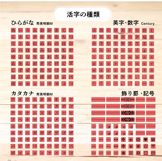 ★ひらがな・カタカナ・英字・数字・記号・飾り罫の6種類、計306個の活字入り