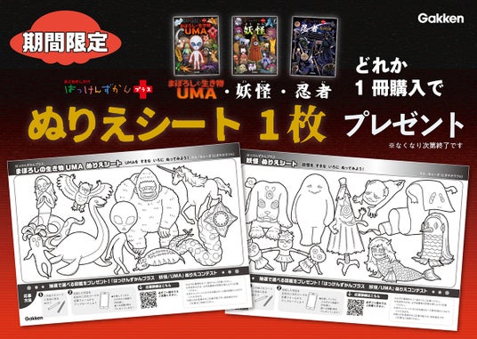 一部書店にて今だけの豪華特典として、ぬりえシートを配布中! 本書『まぼろしの生き物 UMA』をご購入いただくと「まぼろしの生き物 UMA ぬりえシート」を、同シリーズ『妖怪』『忍者』のどちらかをご購入いただくと「妖怪 ぬりえシート」をプレゼントします。