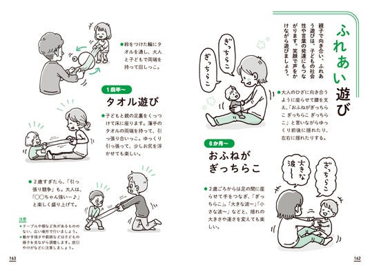 ▲子どもと一緒に楽しむ「ふれあい遊び」をイラストでわかりやすく紹介しています。親子で向き合う遊びは子どもの発達につながります。笑顔で楽しく遊びましょう!