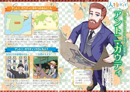 巻頭の「人物ガイド」では、ガウディが活躍した場所や、ガウディの性格、登場人物を紹介しています。お話を読む前にイメージがわき、読書のスタートの手助けとなります。