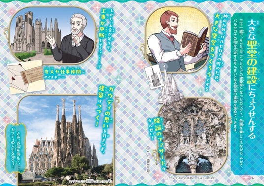 たっぷりのイラストにより、ガウディの伝記が小学校低・中学年から楽しく読めます。「サグラダ・ファミリア」建設の様子をはじめ、「グエル公園」や「カサ・ビセンス」など、世界遺産に登録されたガウディの建築物も、色鮮やかに描かれています。ガウディの世界観が視覚的に伝わるので、建築家の伝記を初めて読む子どもでも親しみやすく、理解が深まります。