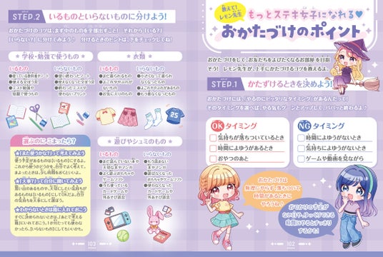 「キララとピーチのかわいいの魔法」は、ドキドキワクワクな物語&かわいいイラストで楽しく読み進めながら、「おかたづけ」「一生役立つ考え方」「マナーのきほん」などのステキ習慣が身につくシリーズ。第1巻では、おかたづけのポイントを学べるコラムが収録されています。