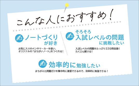 まちがえた問題だけを集めたノートをつくりたいけれど、問題をコピーして、切って、ノートに貼って…つくるまでが大変! そんな“あるある”を解決する高校入試対策の問題集です。あなたの使い方を見せてください!