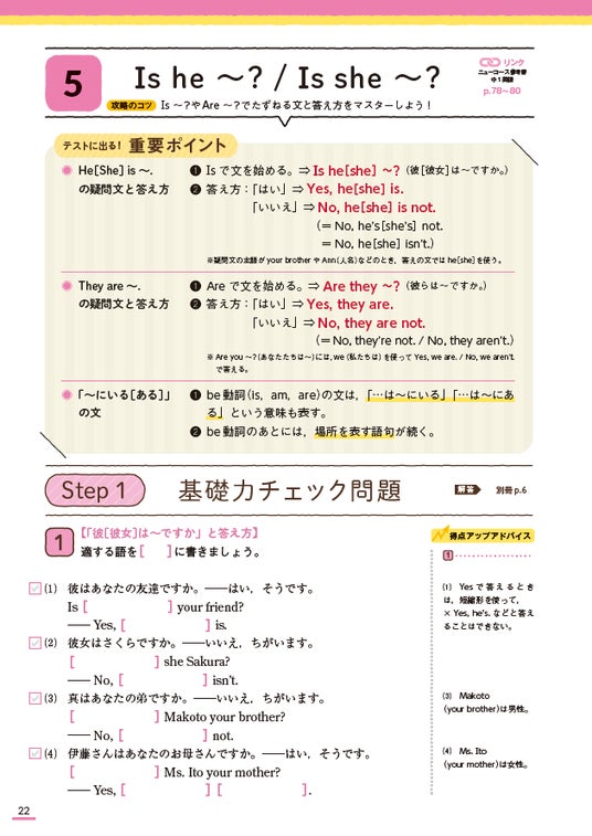 ▲〈中1英語〉重要ポイントをおさえたら、基礎力チェック問題で確認してみましょう。