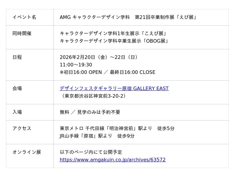 エンタメ業界のプロを育成するアミューズメントメディア総合学院(東京都渋谷区/理事長:吉田 東吾、以下 AMG)は、キャラクターデザイン学科による卒業制作展「AMG キャラクターデザイン学科 第20回卒業制作展『えび展』」を、2026年2月20日(金)から22日(日)までの3日間、デザインフェスタギャラリー原宿にて開催いたします。入場は無料・予約不要です。(※入学者見学会は要予約)