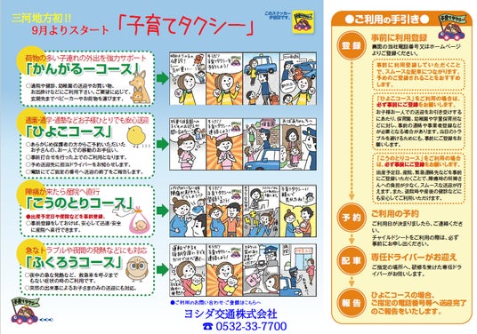子育て家庭が安心して外出できる環境づくりのため、乳幼児を伴っての外出サポートや、子どもの送迎などを行う「子育てタクシー」の運行を実施。