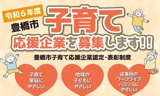 豊橋市では、市民や従業員に対する子育て支援の取組を積極的に進めている企業を「豊橋市子育て応援企業」として認定・公表することで、企業の子育て支援施策を推進し、子育てしやすいまちづくりを進めています。