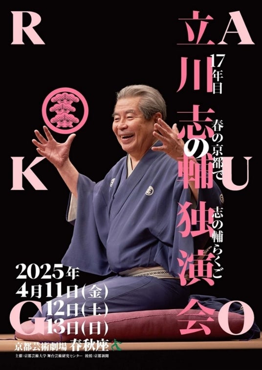 17年目を迎える京都・春秋座での独演会を3日間開催。今年も見逃せません。古典・新作を問わず落語に新しい息吹を吹き込む「志の輔らくご」をお楽しみください。京都の伝統工芸を発信する京都芸術大学KYOTO T5(京都伝統文化イノベーション研究センター)による、毎年好評のオリジナルグッズの販売も予定!