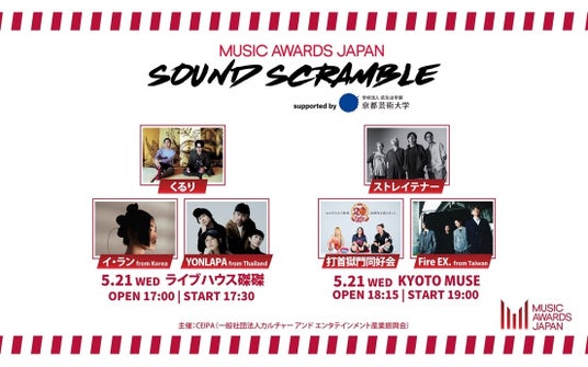 音楽業界の主要5団体(日本レコード協会、日本音楽事業者協会、日本音楽制作者連盟、日本音楽出版社協会、コンサートプロモーターズ協会)が垣根を越えて設立した、一般社団法人カルチャーアンドエンタテインメント産業振興会(CEIPA)によるアワード「MUSIC AWARDS JAPAN」(MAJ)内の開催ウィークにて、京都のライブハウスで世代・国境を超えるバンドが共演する「MUSIC AWARDS JAPAN SOUND SCRAMBLE supported by 京都芸術大学」を5月21日(水)に開催いたします。