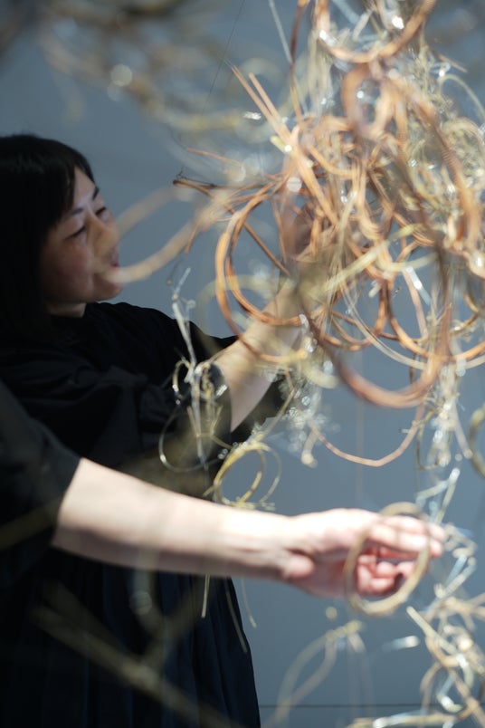 第1展示室:"kurayami" 暗い空間に、ピアノやギターの弦の廃材を再利用したオブジェが浮遊し、深々と静かにその輝きを放つインスタレーション作品を展示します。それぞれの心に語りかけるような内省のひとときを体感してください。