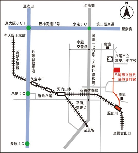 ・近畿自動車道八尾ICを降り、国道170号線(通称外環状線)平田川交差点まで約20分、資料館まで約5分