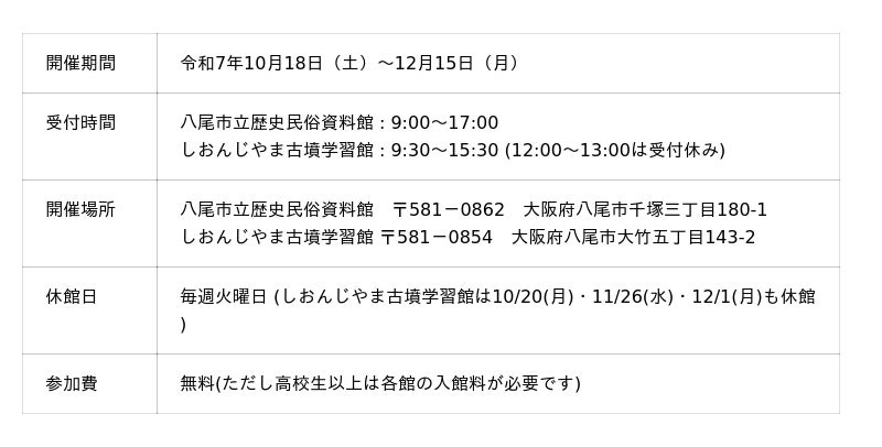 観覧料の免除 中学生以下、身体障害者手帳、療育手帳または精神障害者保健福祉手帳の所持者及びその介助者並びに学校園行事の引率者(八尾市立歴史民俗資料館設置条例第10条の2第3項及び別表により設定。)