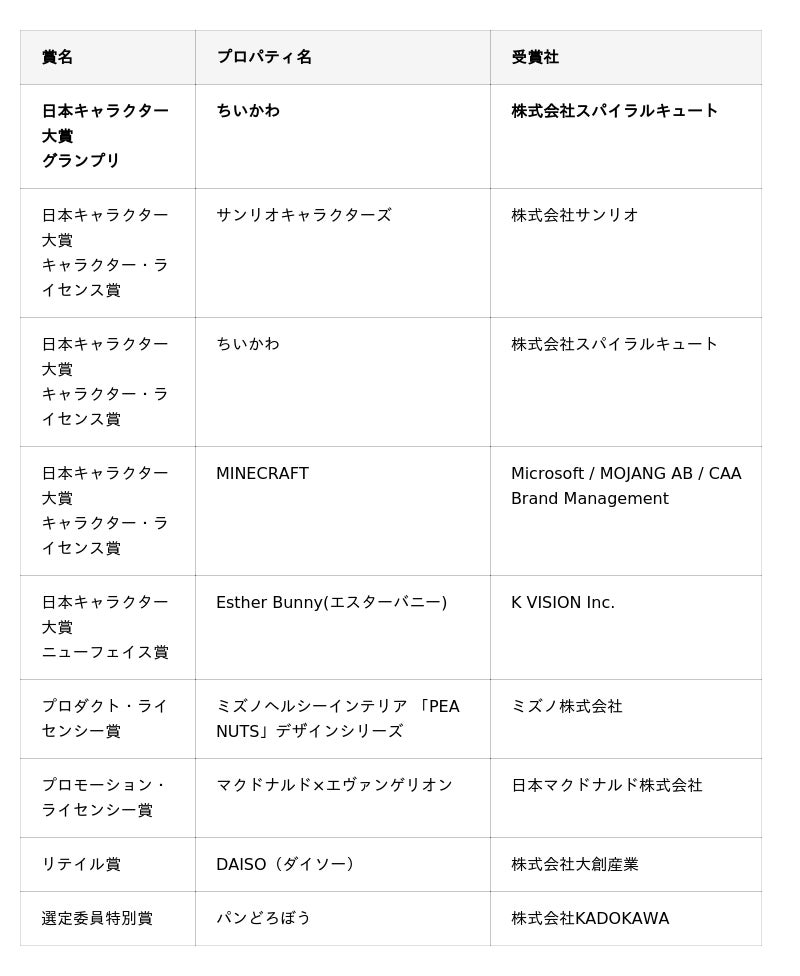 ライセンス産業の価値の発信および業界の健全な発展への寄与を目的に、 キャラクターおよびライセンスビジネス業界のアワード、「日本キャラクター大賞」を開催。本アワードでは、2024年における国内最高のライセンスブランドとキャラクターを決定いたします。ノミネートされたプロパティのなかから、2024年に最も活躍したプロパティが各部門で選出されました。