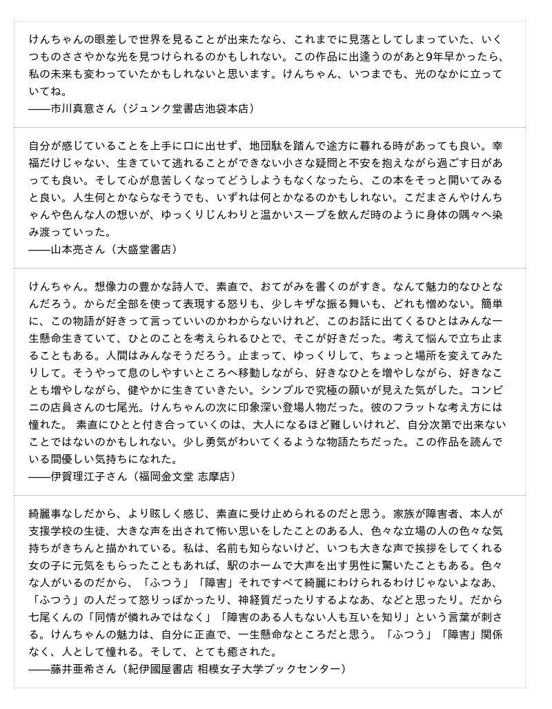 扶桑社より発売中の、「障害」や「ふつう」を静かに問い直す小説『けんちゃん』(著:こだま)に、各界の著名人や全国の書店員から反響が寄せられています。 今回新たに、小説家としても活躍するNMB48・安部若菜さん、本屋大賞受賞作家・町田そのこさん、そして昨年のM-1グランプリで準優勝を果たし注目を集めるお笑いコンビ・ドンデコルテの渡辺銀次さんから推薦コメントが到着しました。 それにあわせて書店向けのPOPを新たに制作したほか、公式サイトも公開しています。