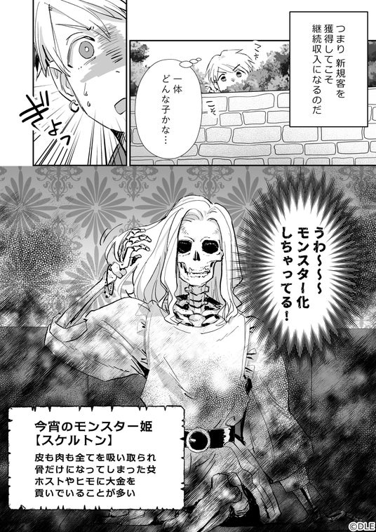 ホストクラブ「ツクヨミ」には今宵もモンスター化した姫が訪れる。今日の客は、彼氏に大金を貢いでしまったために、痩せこけすぎた“スケルトン”である。
