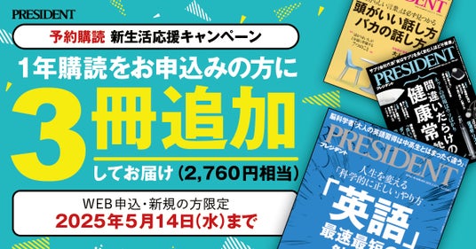 株式会社プレジデント社(所在地:東京都千代田区、代表取締役社長:鈴木勝彦)は、ビジネス雑誌『PRESIDENT』の予約購読キャンペーンを実施いたします。本キャンペーンでは、通常の1年購読(24冊)に加え、さらに3冊(2,760円相当)をプレゼントいたします。