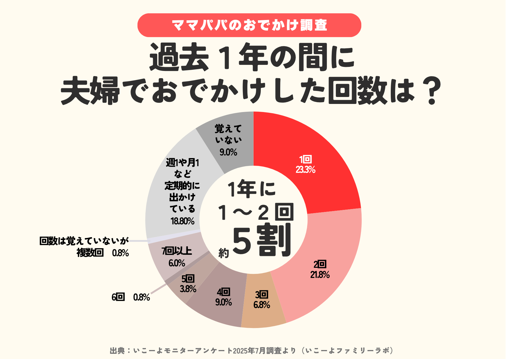 過去1年間に夫婦2人でのおでかけをした世帯のおでかけ回数は、1年に1~2回が約半数(45.1%)。また、 「定期的にデートしている」と答えた世帯も18.8%いました。
