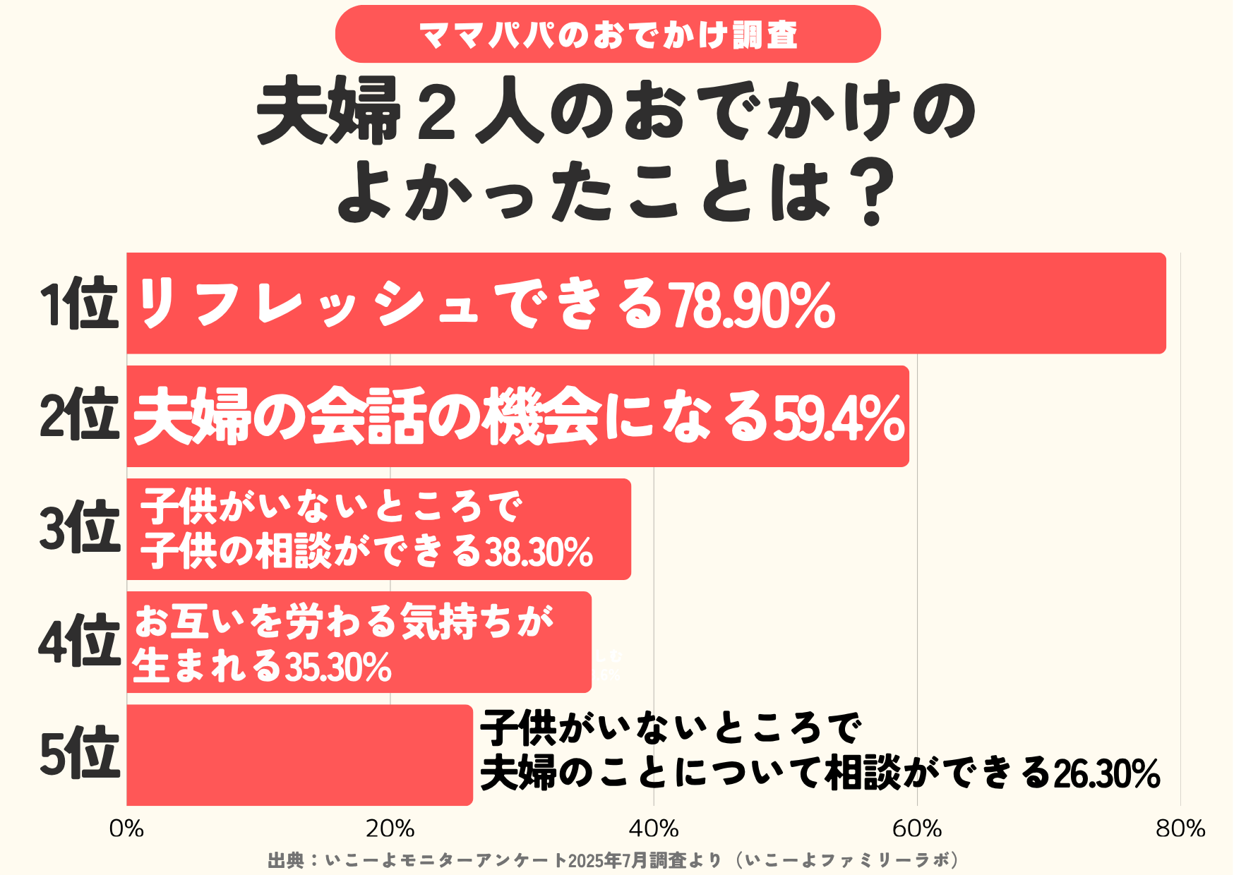 夫婦ふたりのおでかけでよかったことは、「リフレッシュできる」(78.9%)、「会話の機会になる」(59.4%)など。夫婦だけの特別な時間を過ごすことにポジティブな効果を感じたという声が多数寄せられました。