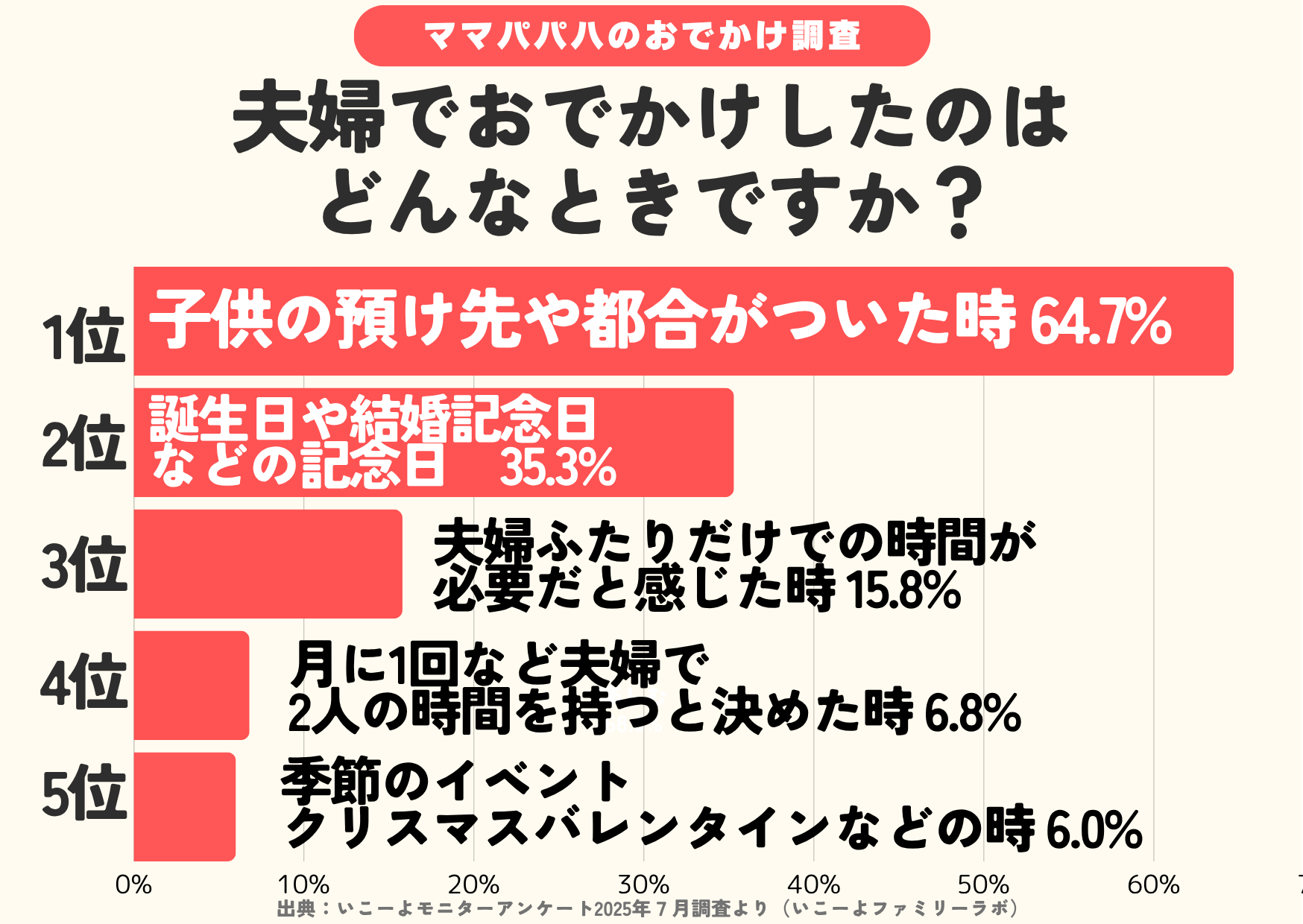 ▶夫婦でおでかけしたのは1位「子供の預け先や都合がついた時」(64.7%)。