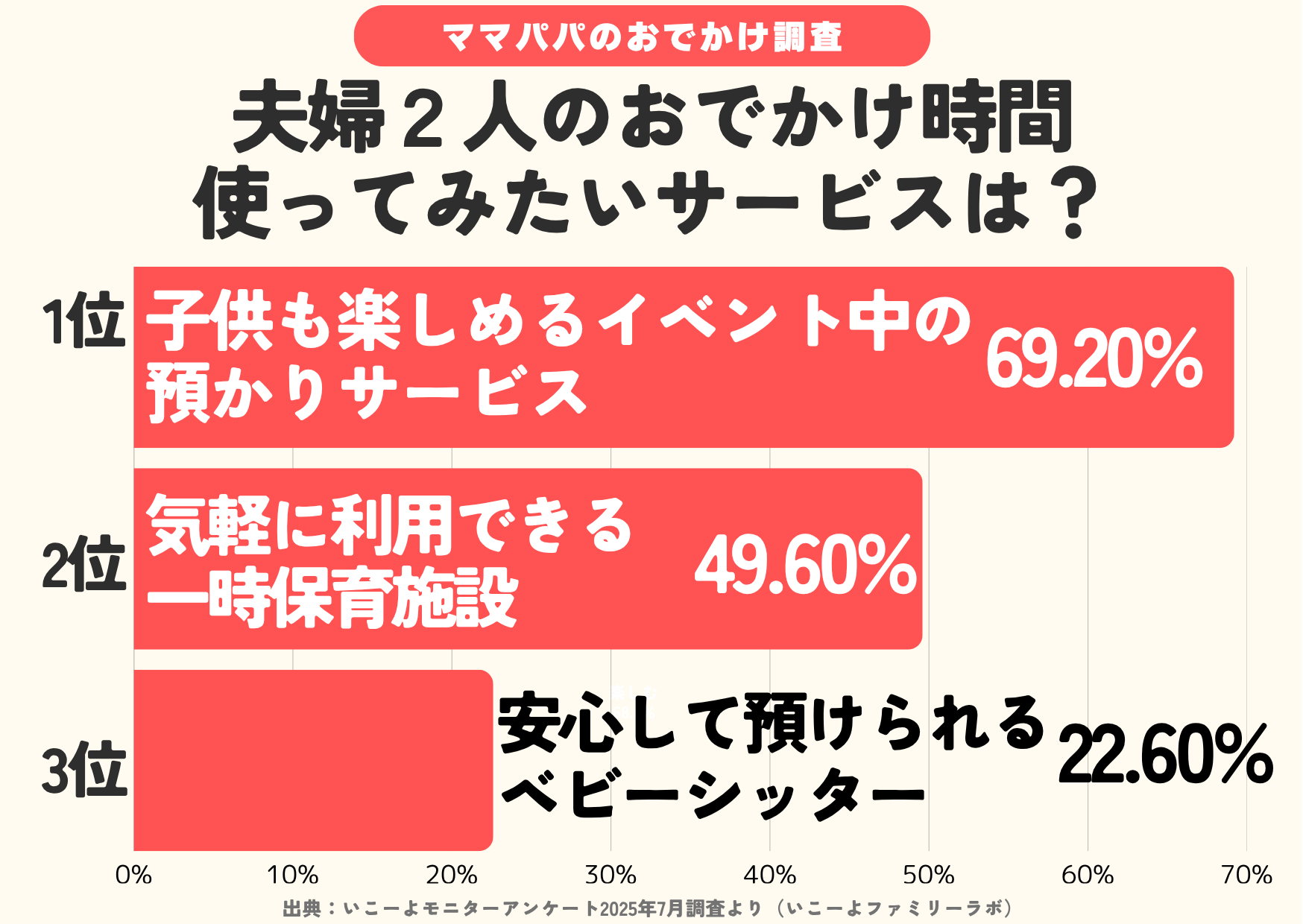 「子供も楽しめるイベント中の預かりサービス」(69.2%)が最も多く、次いで「気軽に利用できる一時保育施設」(49.6%)、「安心して預けられるベビーシッター」(22.6%)が続きました。