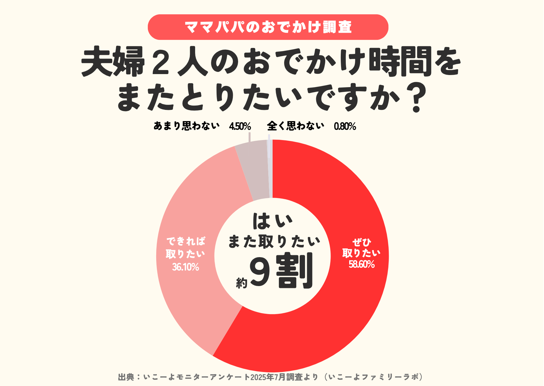 子育て中の夫婦の約6割が「この1年間で夫婦だけのデートはゼロ」と回答。一方で、夫婦でおでかけした9割以上が「今後も夫婦2人の時間を取りたい」と希望しています。「預け先の確保」や「子供の心配」など「夫婦2人」の「おでかけ時間」と「おうち時間」について抜粋して紹介します。