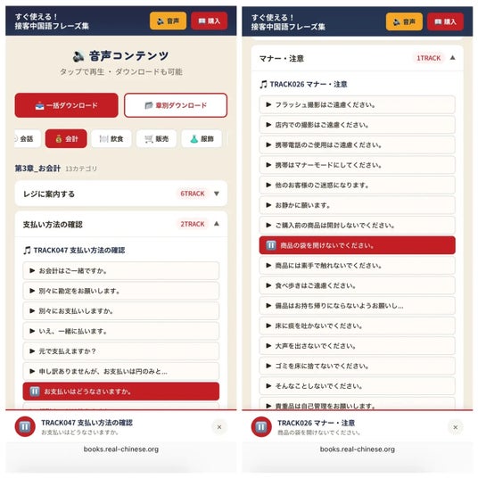 音声は、スマートフォンなどのブラウザ上でウェブ再生できるほか、ダウンロードにも対応しています。必要なシーンに応じて該当フレーズを確認しやすく、移動中や接客前、学習時の反復にも活用しやすい仕様です。