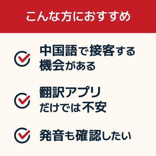 書名には「接客」とありますが、本書は接客業務だけに用途を限定した内容ではありません。 接客の現場で使われる中国語には、注文、案内、会計、声かけなど、旅行中にも頻出する表現が多く含まれます。さらに第2章では、相づち、褒め、謙遜、雑談など、街中や日常会話でも使われる表現をまとめて収録しており、接客を軸にしながらも、旅行や中国語学習にも活用しやすい構成としています。