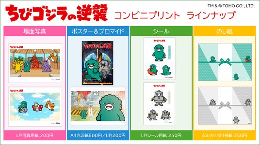 コンビニプリント TVアニメ『ちびゴジラの逆襲』は、クセが強すぎるちび怪獣たちの日常を捉えた「場面写真」や「ポスター&ブロマイド」をはじめ、完全オリジナルの「シール」や「のし紙」をプリントできるサービスです。