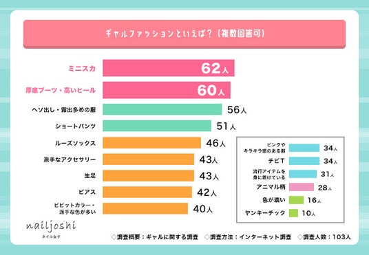 次に「ギャルファッションといえば?(複数回答可)」と質問したところ、ギャルファッションの代表格として「ミニスカ」(62人)が1位。続いて「厚底ブーツ・高いヒール」(60人)が僅差で2位となり、ギャルの特徴的な、足元を派手にするスタイルがギャルファッションとして印象に残っているようです。