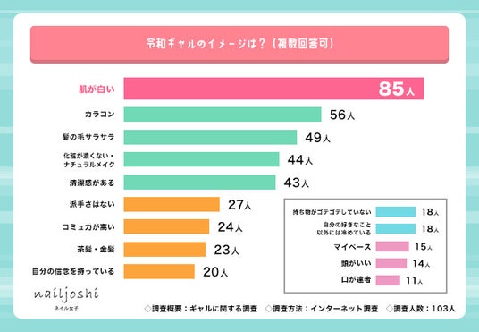 次に「令和ギャルのイメージは?(複数回答可)」と質問したところ、令和ギャルのイメージとして最も多かったのは「肌が白い」(85人)で、平成ギャルの特徴だった日焼けとは対照的な傾向が見られました。