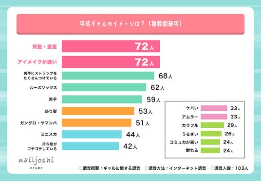 ・平成ギャルのイメージは「茶髪・金髪」「アイメイクが濃い」が同率トップ、次いで「携帯にストラップをたくさんつけている」