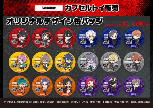 池袋店・中川1号線店・梅田店・福岡天神店・調布駅前店・町田ジョルナ店の6店舗にて、オリジナルデザイン缶バッジをカプセルトイ販売いたします。