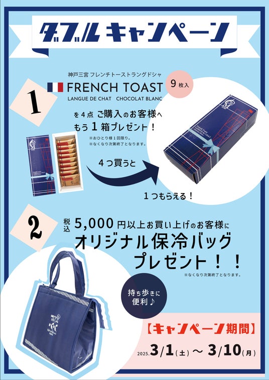 1.期間中に当店の「神戸三宮フレンチトーストラングドシャ」9枚入りを4点ご購入のお客様へもう1箱プレゼント!また2.税込5,000円以上のお買い上げで持ち運びに便利な〈コンディトライ神戸オリジナル保冷バッグ〉をプレゼントいたします。