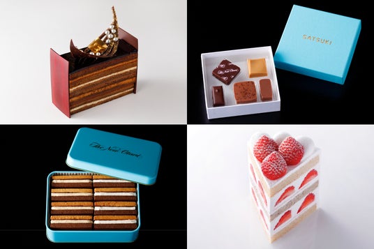 鮮やかなブルーが目を惹く「パティスリーSATSUKI」の人気ギフトスイーツ各種から、“ホテルの総力を結集して作り上げる究極のショートケーキ”をコンセプトにした「スーパーシリーズ」など、多彩なバレンタインスイーツをご用意しました。