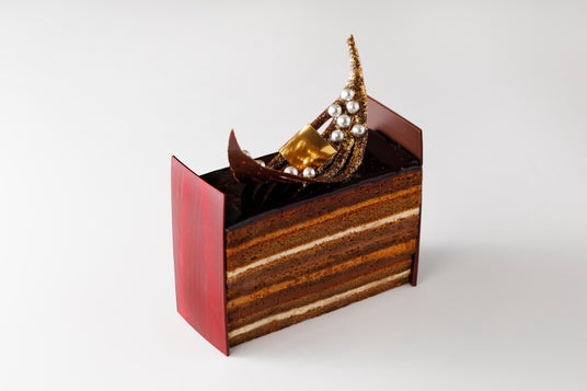 華やかなデコレーションと、14層にも重なる濃厚な味わいのチョコレートケーキ『スーパーオペラレジェール』。高さ8.5 cmの生地は14層構造で仕上がっており、1層1層にこだわり、厚みや食材を変えて極上の味を演出しています。2種類のガナッシュに、2種類のクリーム、中でも、カラメルバタークリームが味の決め手。それらの食材を深い味わいのエスプレッソを含ませた7層のビスキュイで挟み込んで、14層に仕上げ、中にはアクセントにカラメリゼしたアーモンドを。高品質、かつ繊細な技が全体に駆使され、チョコレート好きにはたまらない大人の味わいです。