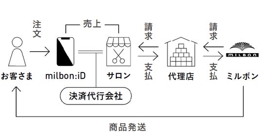 美容室は、milbon:iDというモール型ECサイトに自店のオンラインストアを開設します。お客さまは「いつも通っている美容室から商品を購入する」形となるため、販売管理は美容室が行い、売上も美容室に計上されます。