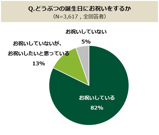 「どうぶつの誕生日にお祝いをするか」という質問に対して、82%の飼い主様が「お祝いしている」と回答しました。