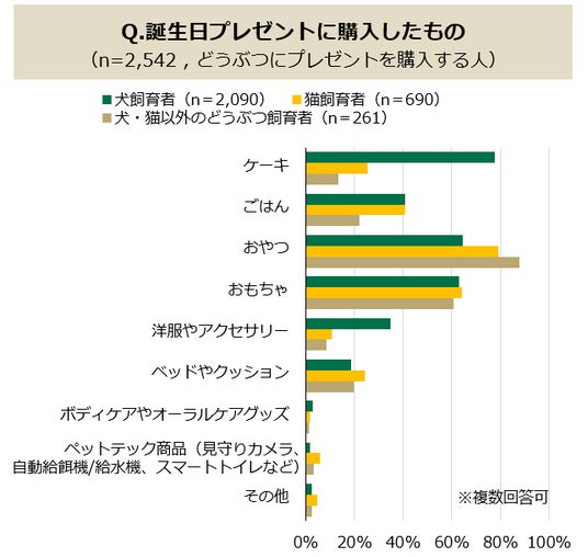 誕生日プレゼントとして購入したものとしては、犬では「ケーキ」が1位、2位が「おやつ」、僅差で3位が「おもちゃ」となったのに対して、猫とその他のどうぶつでは1位が「おやつ」、2位が「おもちゃ」、3位が「ごはん」という結果になりました。