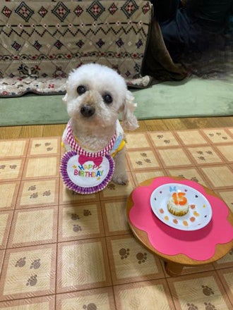 若い時から洋服などが大嫌いで仏頂面になり良い写真が全然撮れなかったのに、今年の15歳のお誕生日は少しだけ機嫌がよくて普通の顔(笑)の写真が撮れた。食べるものも好みが激しくなり、なかなか食べてくれない中 写っているチーズケーキだけは完食してくれたので嬉しかったです。
