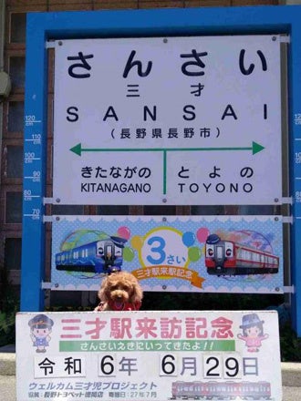 3歳の誕生日に3歳の聖地と言われている三才駅で記念撮影しました。同じ誕生日の3歳児とペットが勢揃いして盛り上がりました。