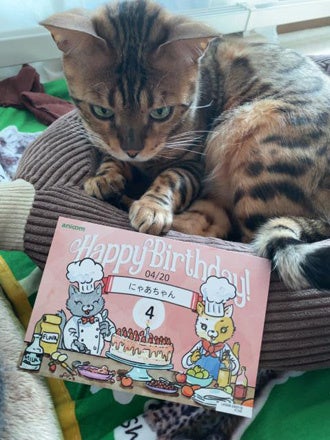慌ただしくしている中でアニコムから届いたバースデーカードと一緒に誕生日当日に撮りました。食事は決まった物しか食べたがらないので実際のケーキ等は準備しませんが、イラストにあるので気持ちだけでもと思い「おめでとう」「大きくなったね」「家に来てくれてありがとう」「これからもよろしく」などと声をかけながら一緒にゆっくりと過ごしました。