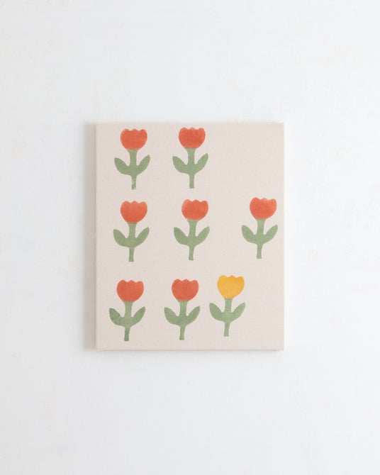 Donchiは、同じかたちを型染めの技法でひとつずつ帆布に染めていくアーティストです。繊細な揺らぎを感じさせるそのフォルムは、どれも少しずつ表情が異なり、じっと見ているとかすかに揺れているようにも、人の姿のようにも見えてきます。