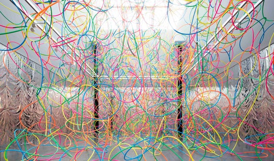 鬼頭健吾1977年愛知県生まれ。2001年名古屋芸術大学絵画科洋画コース卒業後、2003年京都市立芸術大学大学院美術研究科油画修了。現在、京都芸術大学教授。2008年五島記念文化賞を受賞しニューヨークに1年滞在し、その後ドイツベルリンにて制作活動。フラフープやパラソルなど、工業製品の現代的なカラフルさと、生命体や宇宙を感じさせるような広がりを融合させた作品で、国内外から高い評価を受ける。