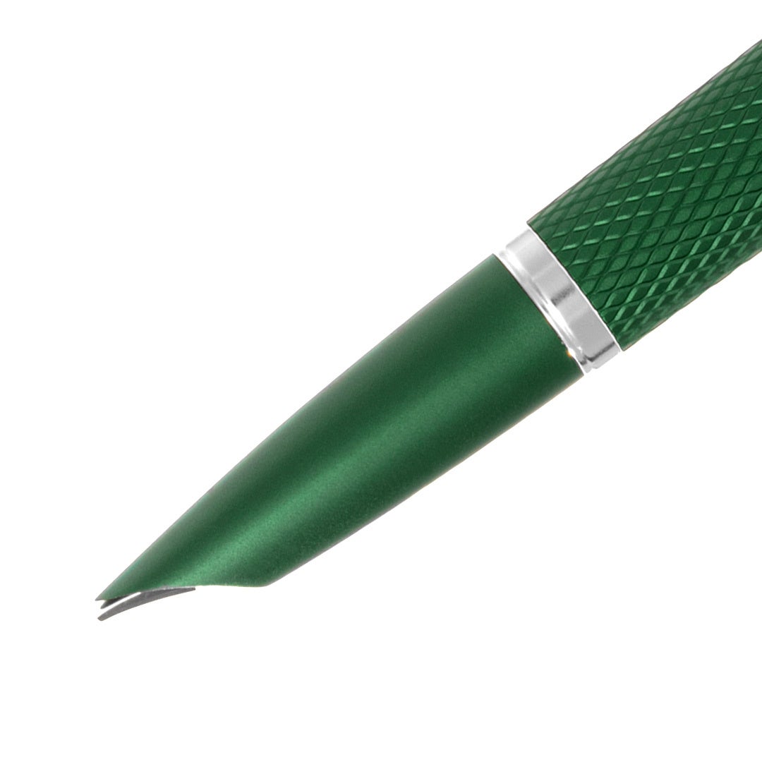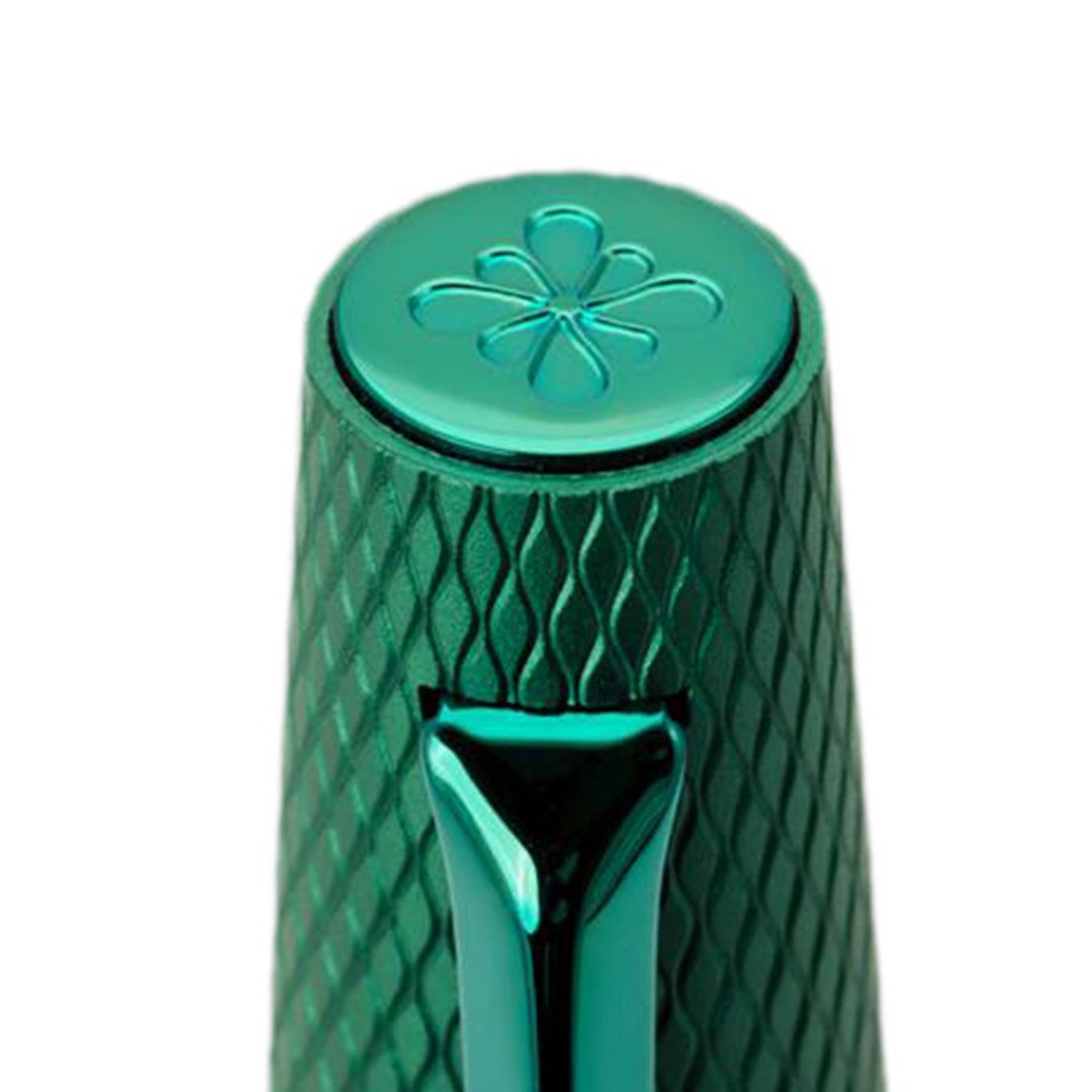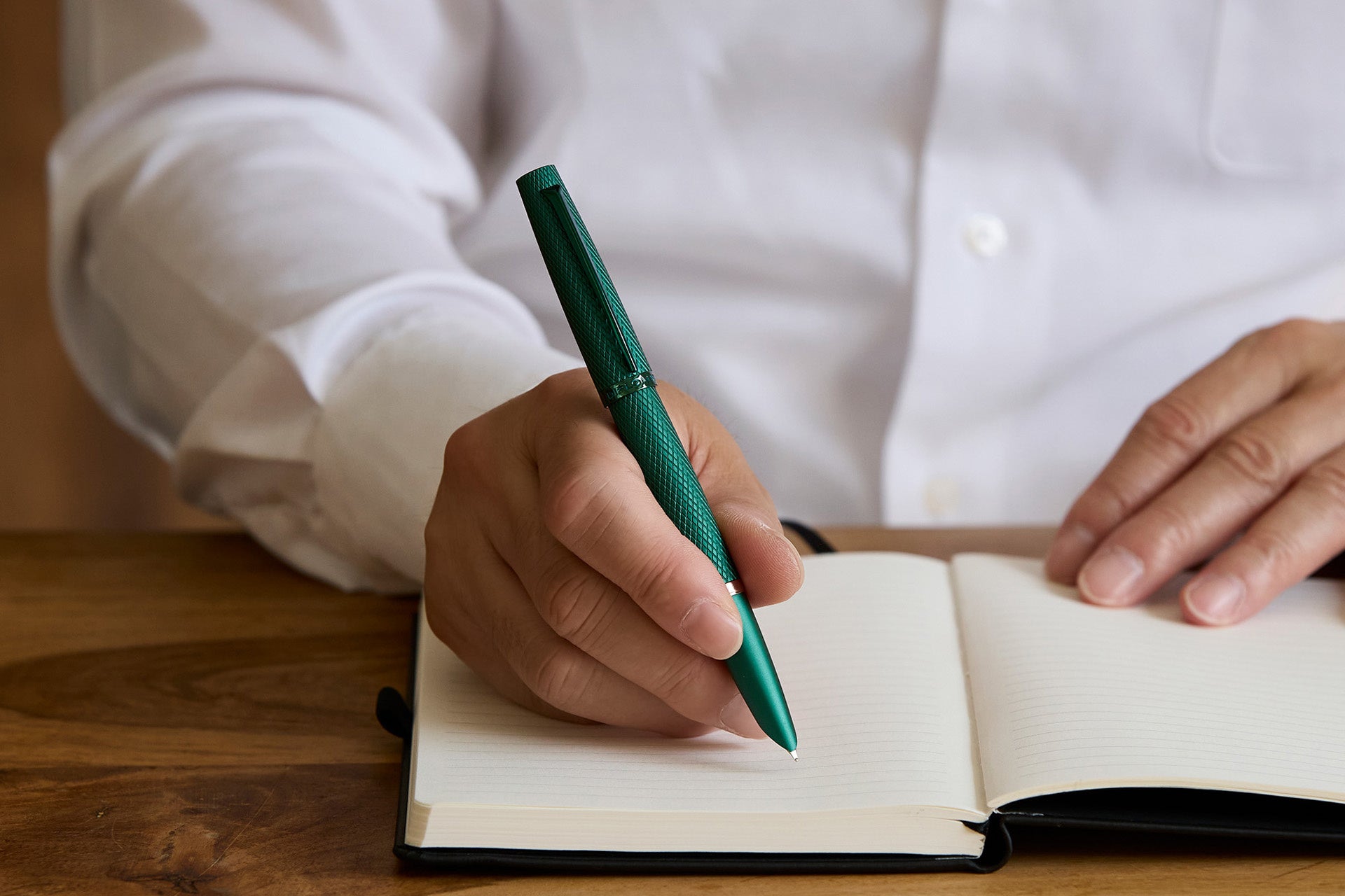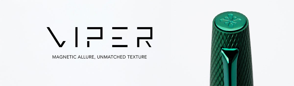 VIPER(バイパー)は、ギロシェパターンの彫刻が、アノダイズ加工のメタリックな風合いの仕上げとも好相性となっており、流線型のフォルムはボディ、グリップ、そして精緻に設計され滑らかな書き味を発揮するフーデッドニブへと一体感のある曲線を描きます。従来使用していた14金ペン先(エクセレンスA2、アエロなど)をステンレスにすることで価格を抑え、初めての万年筆としても最適なアイテムに。機械で代えることの出来ない熟練による手作業で作り上げられたVIPERは、グリーンの登場により、グリーン/ブラウン/ブルー/ブラックの4色から自分のスタイルに合わせて選択できるようになります。